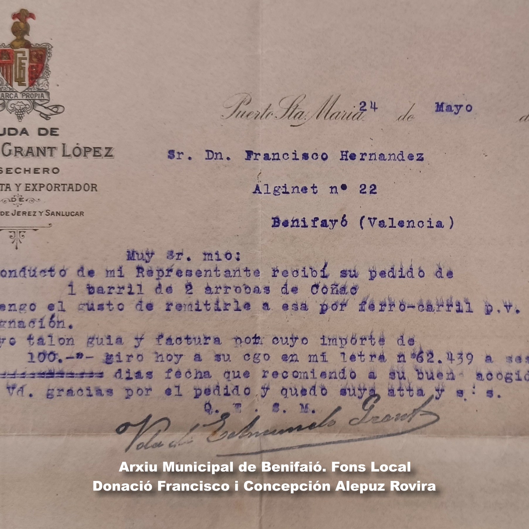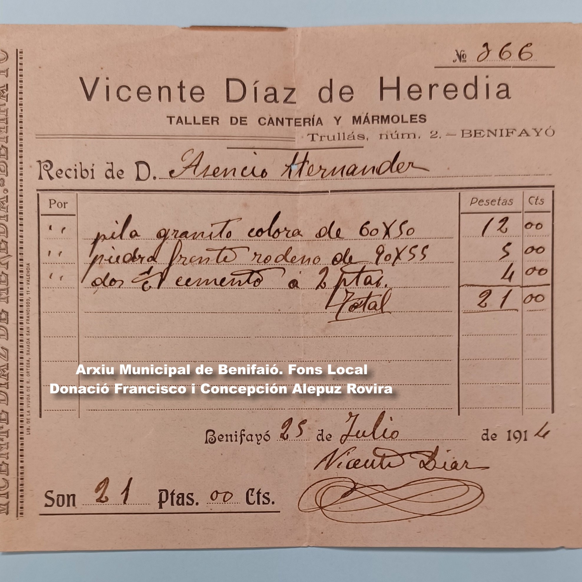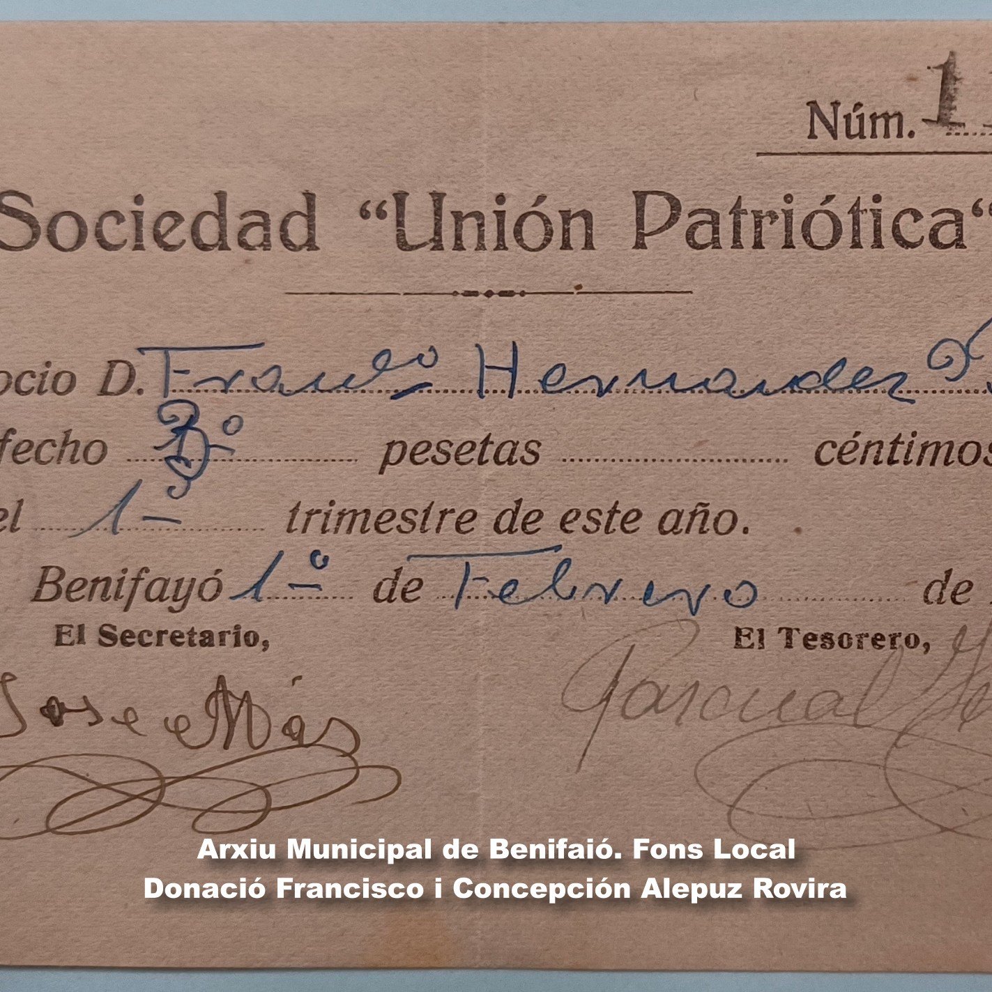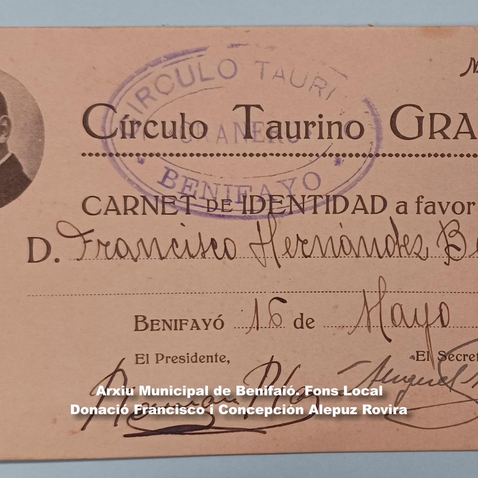 D’altra banda, els germans Conchín i Francisco Alepuz Rovira ens han donat un extens conjunt de documents personals i administratius dels seus avantpassats (Hernández Beltran) amb dates des de 1851 fins 1954, on trobem un preciós exemple de l’administració camperola d’una família benifaionera al voltant, sobre tot, del segle XX, que ja estem ordenant.
