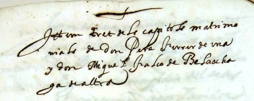 Praeincertum ittems ab stractum fuit a quodam capitulationum inib tractum instrumento facto et firmato per don Petrum Ferrer, ordinis et religionis de Calatrava,[2] ex una, et don Michaelem Falcó de Belaochaga, dominum loci de Benifayó, parte ex altera. Receptoque per Franciscum Mallent, quondam notarii, prima die maii anni MDC vigesimi sextii, et a receptorio dicti Francisci Mallent, per me Josephum Paulum de Rocafull, notarii publicus Valentiae. Libros et notas dicti Francisci Mallent, dominum et regentem vigore et pro executione cuius dampno instionis factae et provisse per justitiam causarum civilium Valentiae, decima seturia die februarii anni millesimi sexcentesimi sexagesimi sexti, registrata in libro mandatorum et empararum curiae civilis Valentiae, sub dicto chalendario.