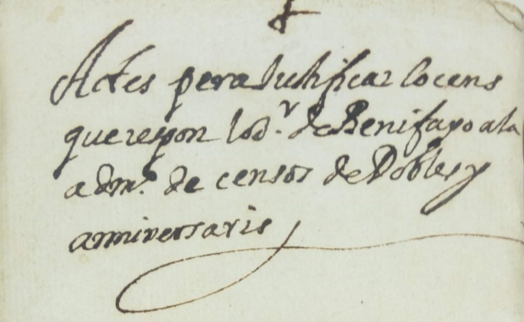 El lligall ve intitular “Actes per a justificar lo cens que respon lo senyor de Benifayó a la administració de censos de Dobles y Anniversaris”, dins el qual trobem una còpia extreta en 1666 del document original de 1623.
